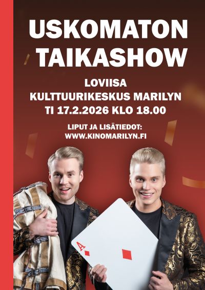 Loviisan Kulttuurikeskus Marilyniin saapuu 17.2.2026 tiistaina klo 18.00 televisiostakin tutun taikurikaksikon Aatun & Jarin mukaansa tempaava taikashow. Suosittu esitys on kiertänyt Keski-Suomessa viime syksyn, mutta nyt on aika täysin uusien paikkakuntien. Reilu tunnin mittainen koko perheen show on sekoitus taikuutta, mentalismia, illuusioita ja hulvattoman hauskaa komiikkaa.
